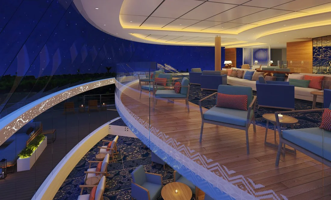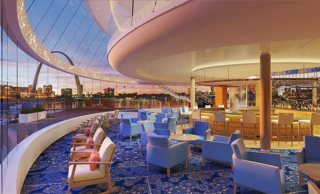 Frequent cruisers on Viking's ocean ships consider the Explorers’ Lounge one of the top onboard public spaces. Viking Mississippi will feature an Explorers’ Lounge near the bow of the ship. The sun-filled, two-story lounge offers floor-to-ceiling windows that open to The Bow, a unique outdoor seating area at the front of the ship where you can relax with ever-changing riverside views.