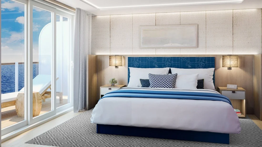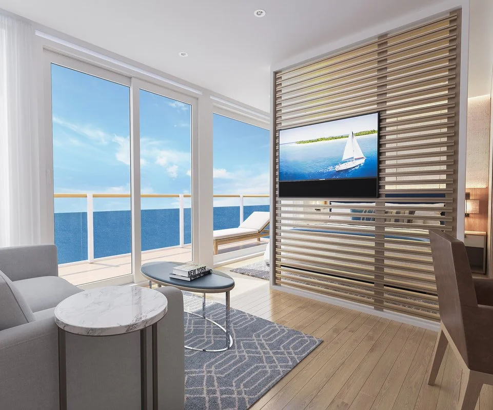 All staterooms feature a private veranda or French balcony, king-size bed with luxury linens, large flat-screen interactive TV, mini-bar, large glass-enclosed shower, heated bathroom floor and 24-hour room service.