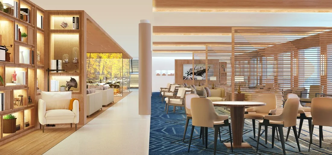Clean Scandinavian design paired with American influences, the Living Room on Deck 1 is designed for socializing, relaxing and entertainment. Nearby, in a quiet corner, The Library is a perfect place to discover a new book.