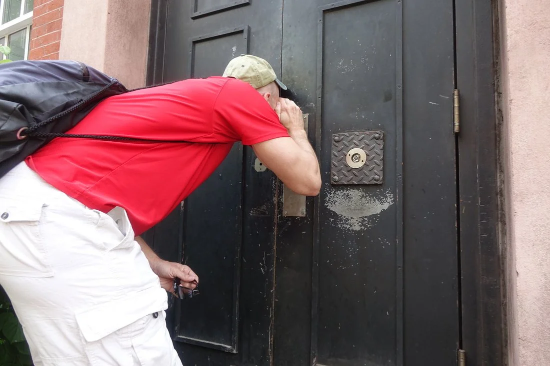 A few blocks away, and we and find another curiosity: the false brownstone townhouse (58 Joralemon Street) that is a facade for a ventilator unit along the subway line (the world's only Greek Revival subway ventilator). Peeking through a crack in the doors, I see a bit of the structure for the No. 4 and 5 trains that is well hidden right in the middle of the Brooklyn Heights neighborhood.