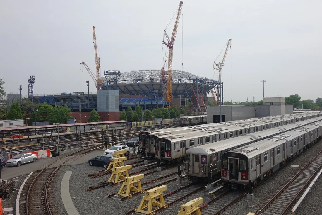 The main tennis court, with renovations in the works, at Flushing Meadows is adjacent to the train yard.