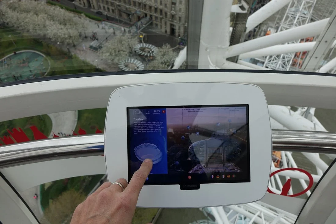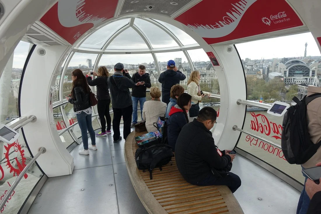 Speaking of those capsules. The London Eye has 32 of them that fit up to 25 people each. You can sit on benches in the middle, but most people stand at the windows to get a good view. It's polite to rotate around and not spend too much time in one spot so that everyone can enjoy all possible vantage points. So, views are obstructed by the structure of the giant wheel itself, of course.