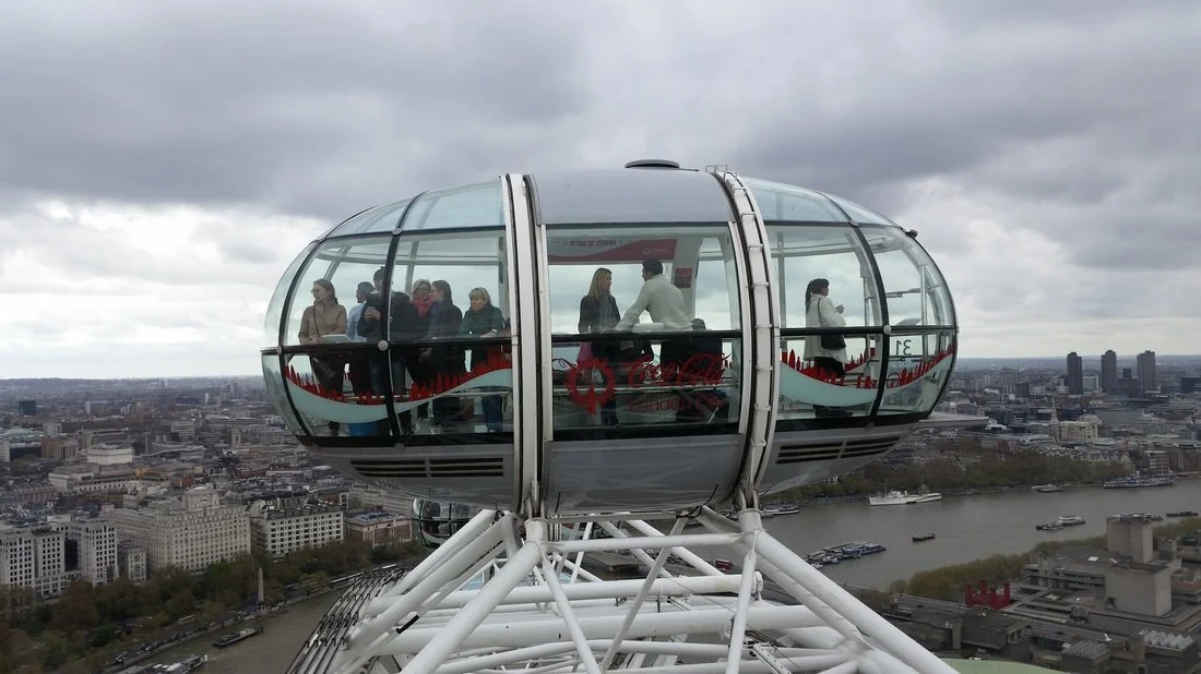 A capsule full of passengers rises to the London sky on a cloudy day.